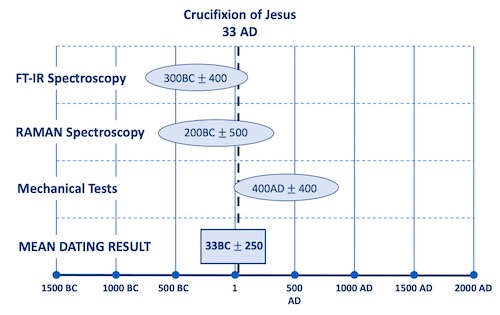 These new dating techniques were clearly at an early stage of development, which is one of the reasons for a camparitively high margin of error on the test results. However, they all produced date results for the Shroud which were many centuries earlier than that produced by the 1988 radiocarbon test. The mean date of the three tests was 33 BC ± 250 years, with a 95% confidence level, a result which is entirely compatible with the belief that this linen cloth was the burial Shroud of Jesus Christ.