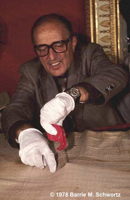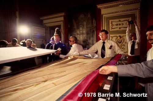At the end of a public exposition in Turin, the Shroud is removed from public display and taken into the Hall of Visiting Princes within Turin's Royal Palace to be examined, photographed and sampled over a period of five days. The scientists involved included the STURP team from the USA plus specialists from Europe including Max Frei, Giovanni Riggi di Numana and Professor Pierluigi Baima-Bollone. The Shroud is examined and photographed using photographic floodlighting, low-power X-rays and narrow band ultraviolet light. Dozens of samples are removed from the fabric surface using sticky tape and apparatus is inserted between the Shroud and its backing cloth to examine the underside, which has not been seen in over 400 years. The bottom edge (at the foot of the frontal image) is also unstitched and examined. Baima Bollone obtains samples of a Shroud bloodstain by mechanically disentangling warp and weft threads in the area of the 'small of the back' bloodstain on the Shroud's dorsal image.