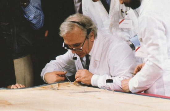 In April, under the supervision of Dr. Michael Tite of the British Museum, a 7 cm by 1 cm strip of cloth is removed from a corner of the Shroud. Postage-stamp sized samples are cut from the strip and given to representatives of three radiocarbon laboratories based in Arizona, Oxford and Zurich. These are taken back to the laboratories to be dated along with three control samples.